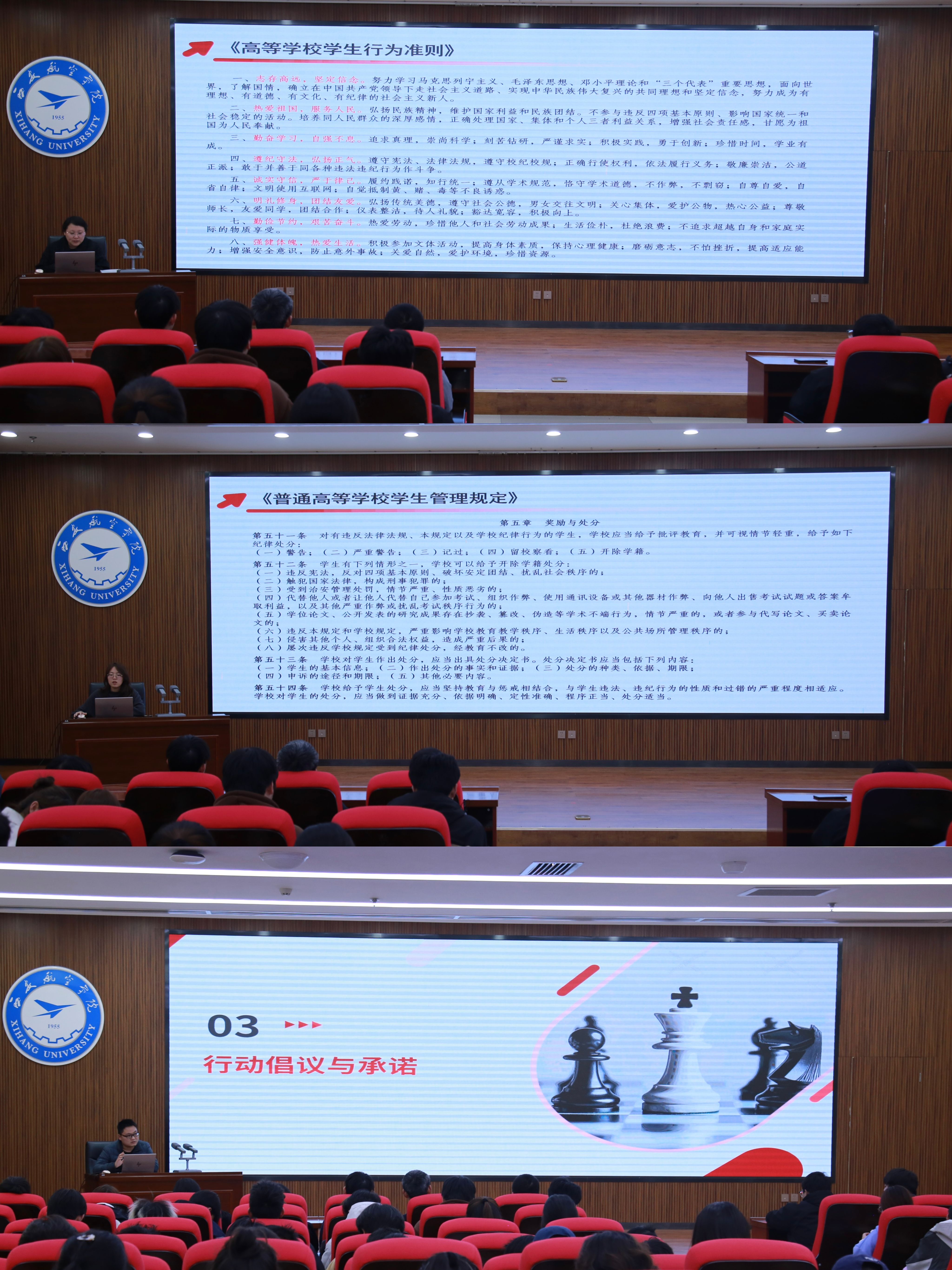 本次学习教育活动主要包括四个方面的内容:一是重点学习《中华人民共和国国家安全法》《中华人民共和国网络安全法》等法律法规有关条款,旨在使全体学生进一步明确应当履行的维护国家安全、荣誉和利益的义务,从而自觉防范和抵制不当的网络行为、非法宗教活动等危害国家安全的行为。二是重点学习《中华人民共和国学位法》《普通高等学校学生管理规定》《国家教育考试违规处理办法》《西安航空学院学生考试违规处理办法(修订)》等有关内容,旨在使全体学生进一步认识严肃学风考风的重要性和必要性,从而强化诚信意识和学术道德。三是重点学习《高等学校学生行为准则》《西安航空学院学生行为规范》等,旨在引导全体学生在日常学习生活中形成良好的道德品质,养成文明行为习惯。四是通过案例进行警示教育。通过剖析近年来发生在高校学生中的典型案例,使全体学生深刻认识违法违规违纪行为的严重危害和后果。
