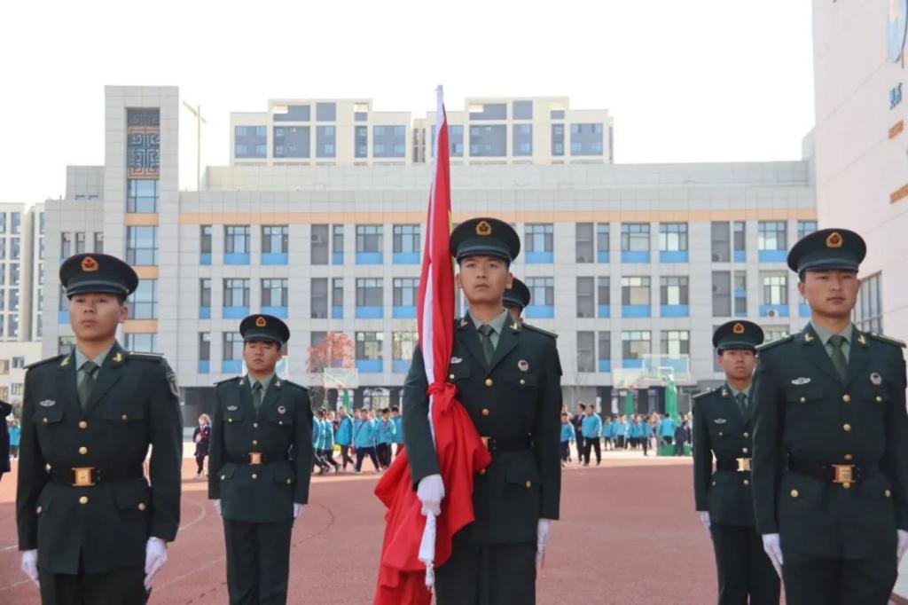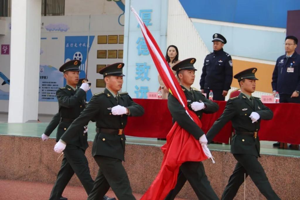 升旗仪式正式开始,庄严的仪仗队护卫着国旗走入场内。国旗护卫队队员们迈着稳健的步伐,在全体师生的目光下,护送国旗入场。