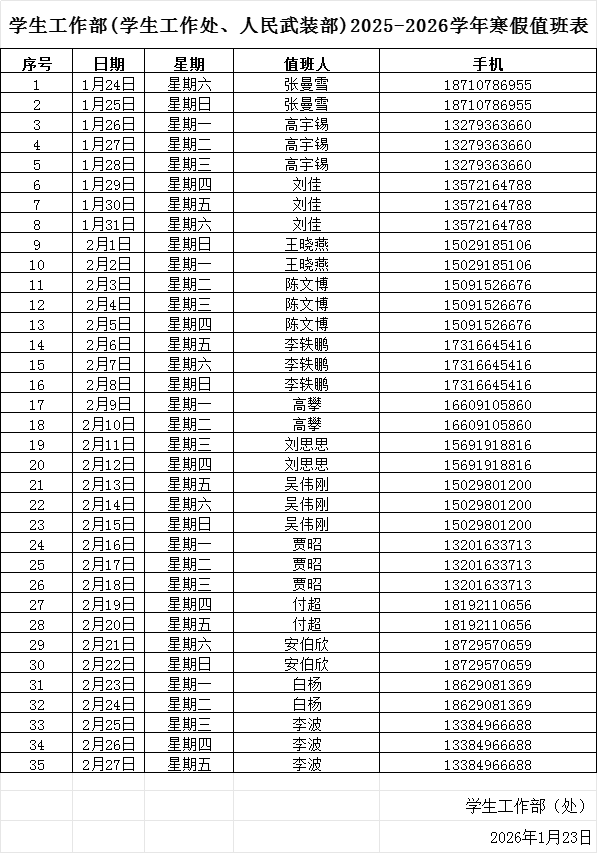 学生工作部(处)2025-2026年寒假值班安排