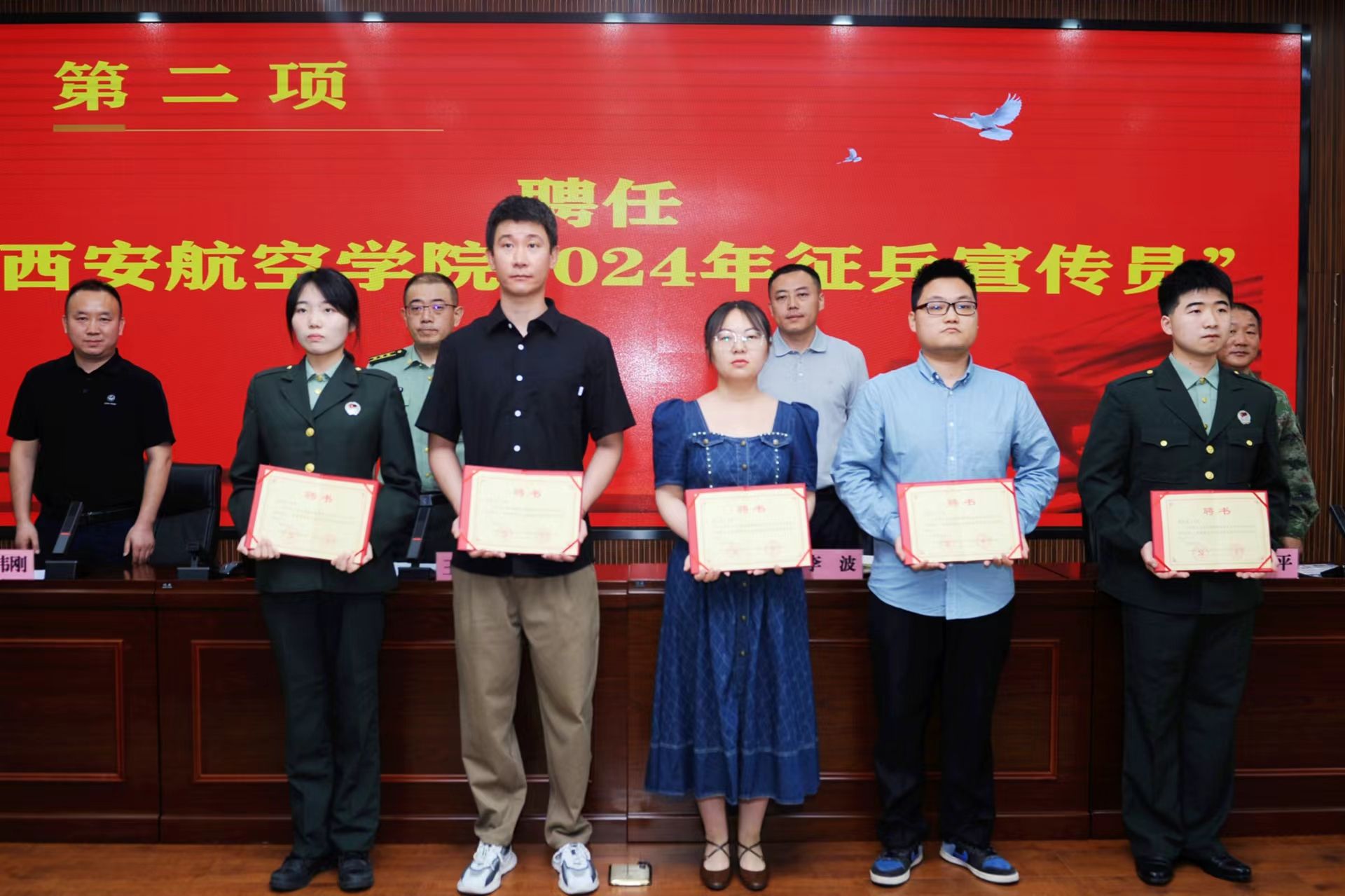 学生工作部(处)长李波宣读了西安航空学院人民武装部、莲湖区人民政府征兵办公室《关于聘任“西安航空学院2024年征兵宣传员”的决定》,与会领导为受聘师生颁发了聘书。“征兵宣传员”代表王语婷结合自身参军入伍的经历与收获、军旅生涯对自己退役复学后学习、生活、成长的积极影响等方面作了表态发言,并号召全体西航学子要争做有理想、敢担当、能吃苦、肯奋斗的新时代好青年,去绿色军营中实现自己的“中国梦”。
