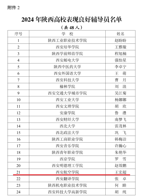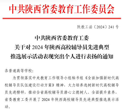 近日,中共陕西省委教育工委对2024年陕西高校辅导员先进典型推选展示活动中表现突出个人进行表扬通报,我校辅导员王宏超获“2024年陕西高校表现良好辅导员”表彰。