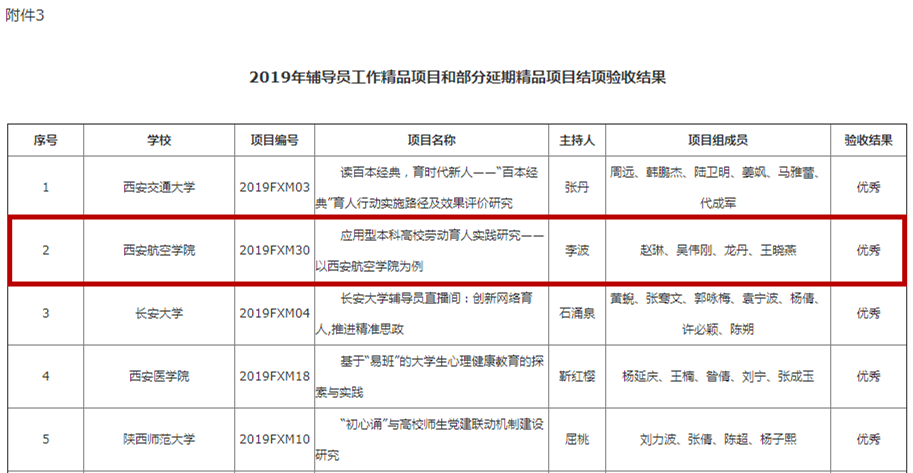 近期,中共陕西省委教育工委公布了第二批陕西高校辅导员工作室终期验收结果和2019年陕西高校辅导员工作精品项目结项结果,我校“航空心翼辅导员工作室”和“应用型本科高校劳动育人实践研究——以西安航空学院为例”顺利通过验收。