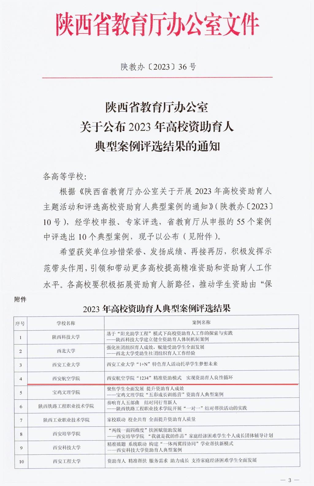 近日,陕西省教育厅公布了2023年高校资助育人典型案例评选结果,我校“‘1234’精准资助模式-实现资助育人良性循环”获评陕西省2023年高校资助育人典型案例。