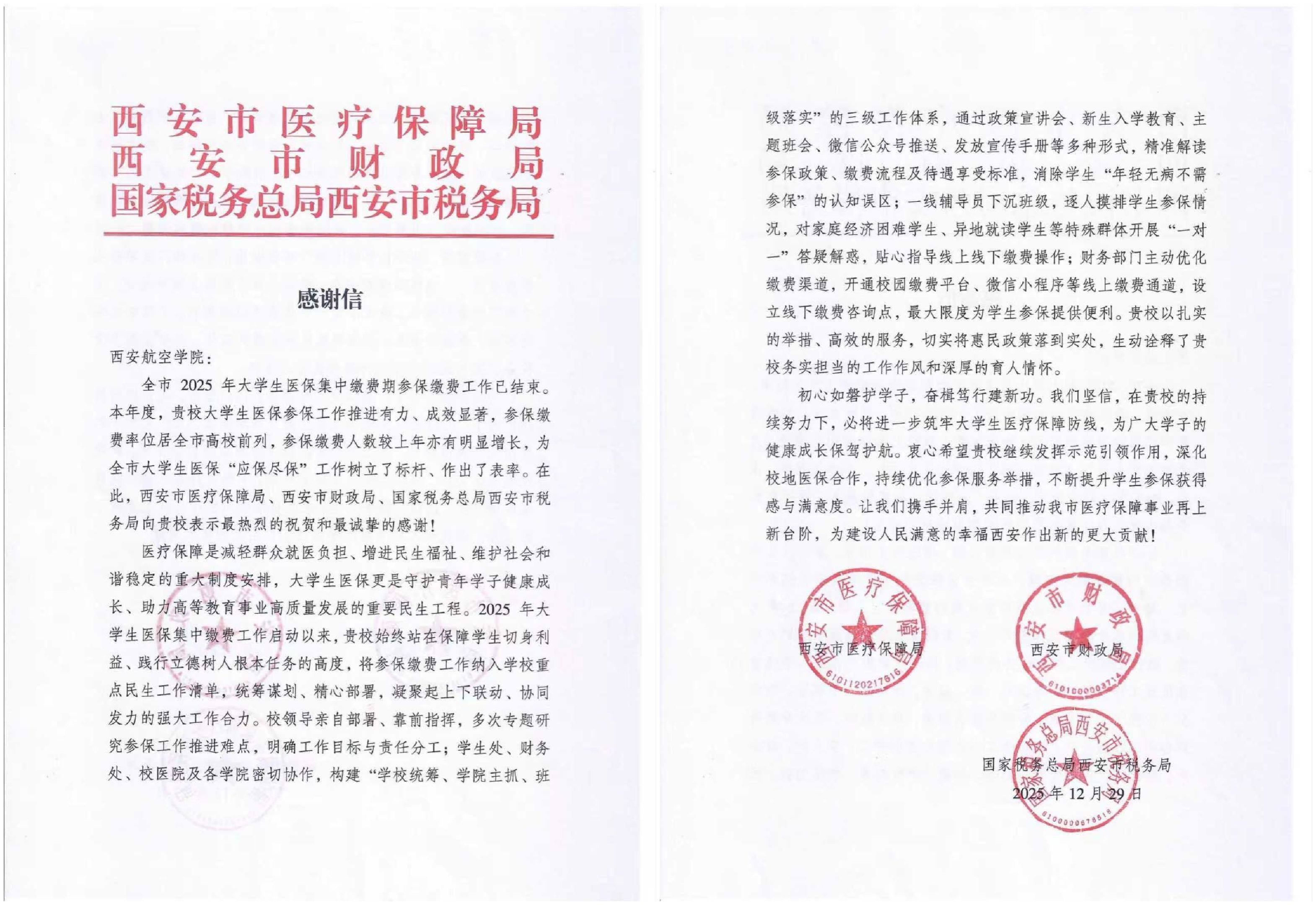 近日,西安市医疗保障局、财政局、国家税务总局西安市税务局联合向我校发来感谢信,对我校2025年大学生医保参保缴费工作的突出成效给予高度肯定。