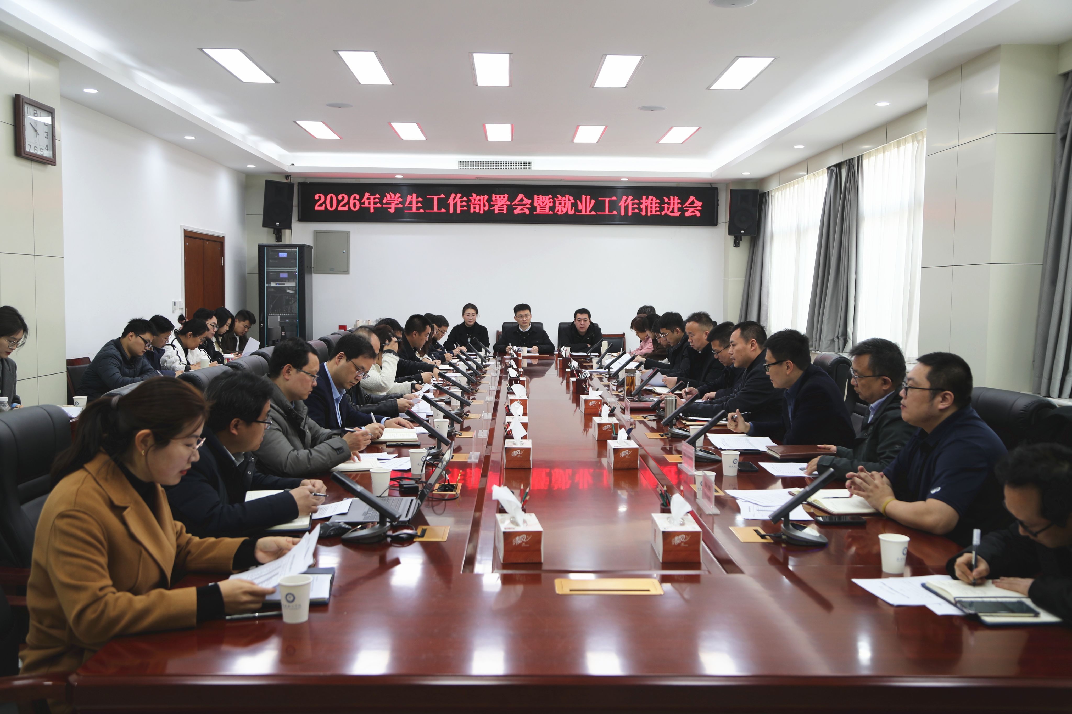 宁永录结合学校发展大局和当前工作实际,对做好2026年学生工作和就业工作提出三点要求。一是要认清形势、提高站位,以“时时放心不下”的责任感扛牢育人使命。要深刻把握上级主管部门工作要求,将学生工作与学校“申硕冲刺年、科技创新年、资源增效年”三个年建设行动深度融合,清醒认识当前学生工作面临的压力和挑战,切实增强工作紧迫感。二是要聚焦重点、精准发力,以“事事落实到位”的执行力提升育人实效。要坚持以前好的经验和做法,在不断创新中争取佳绩,围绕审核评估整改要求和优良学风提升计划两方面抓好学风建设,紧盯2026届毕业生考研录取率、初次去向落实率两个核心指标全力攻坚高质量充分就业,通过安全知识宣传、深入宿舍检查、做好心理干预和应急处置等做好安全风险防范。三是要强化保障、凝聚合力,以“人人奋勇争先”的精气神夯实工作基础。要压实责任链条、建强学工队伍、强化考核激励,树立和践行正确政绩观,凝心聚力、真抓实干,为学校高质量发展和“十五五”良好开局作出新的更大贡献。